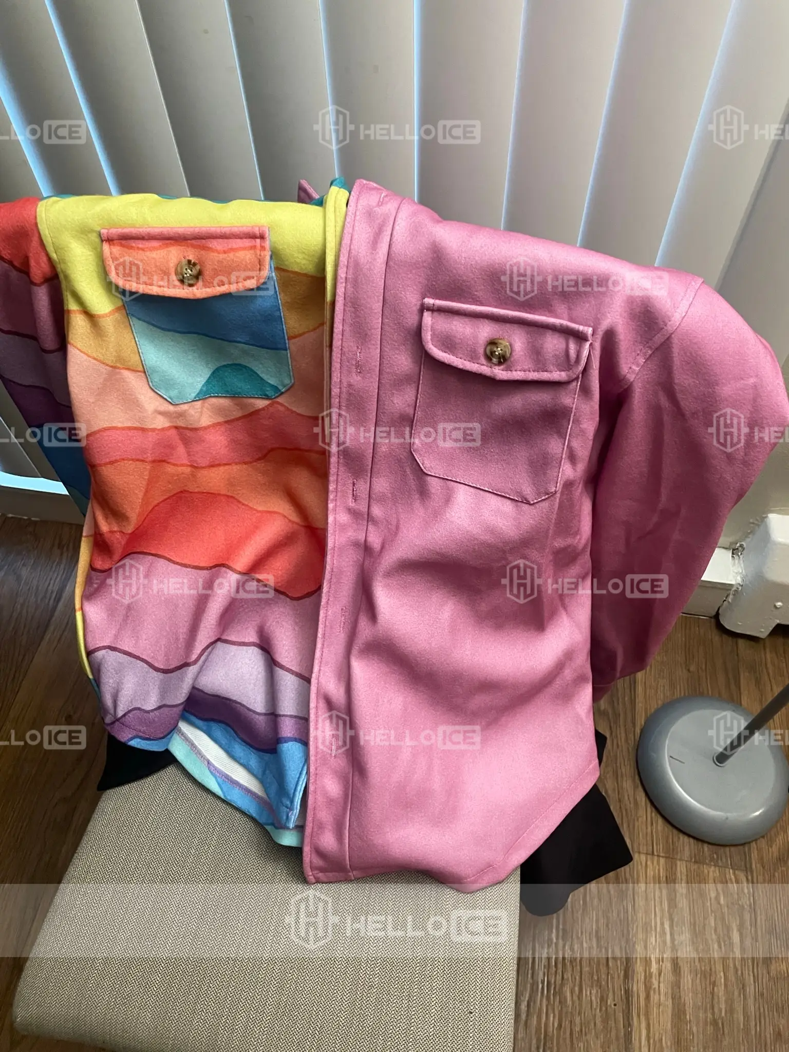 The pink is way lighter than what is on display. The colorful side is still nice ,it took about 3 weeks to receive